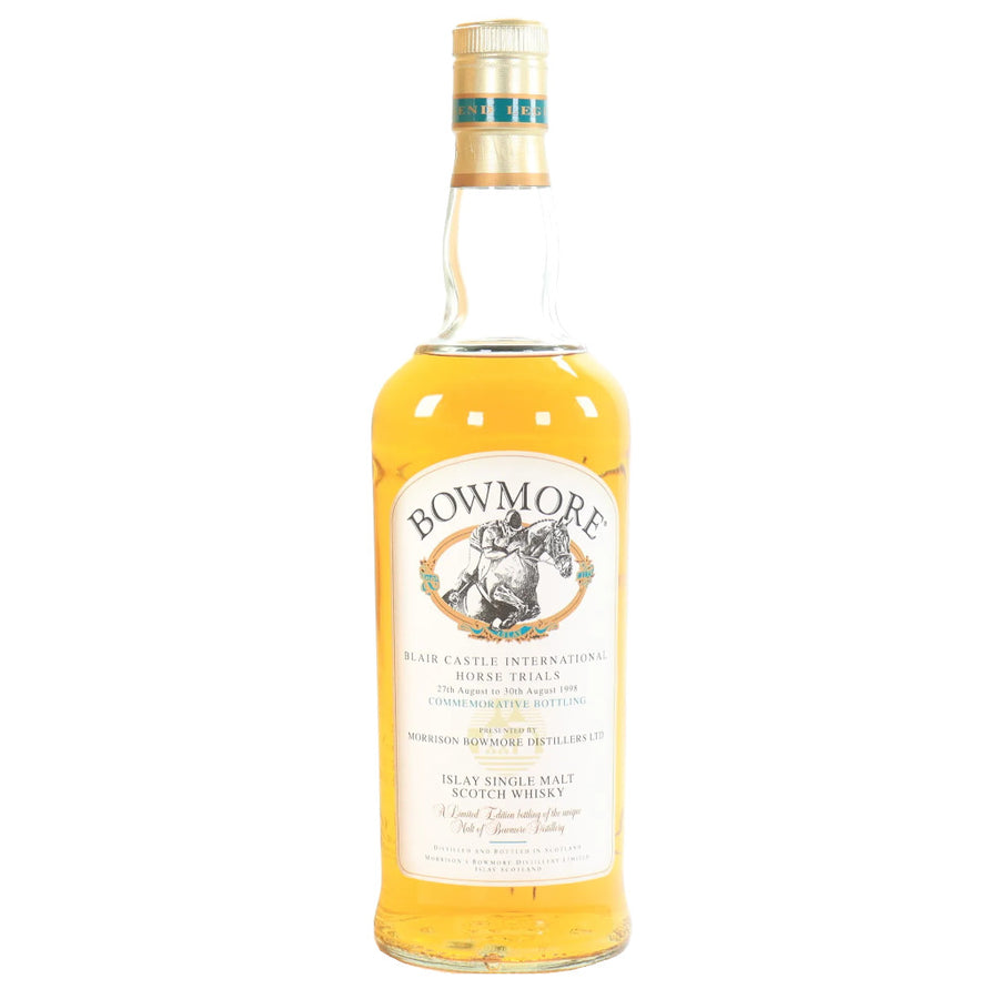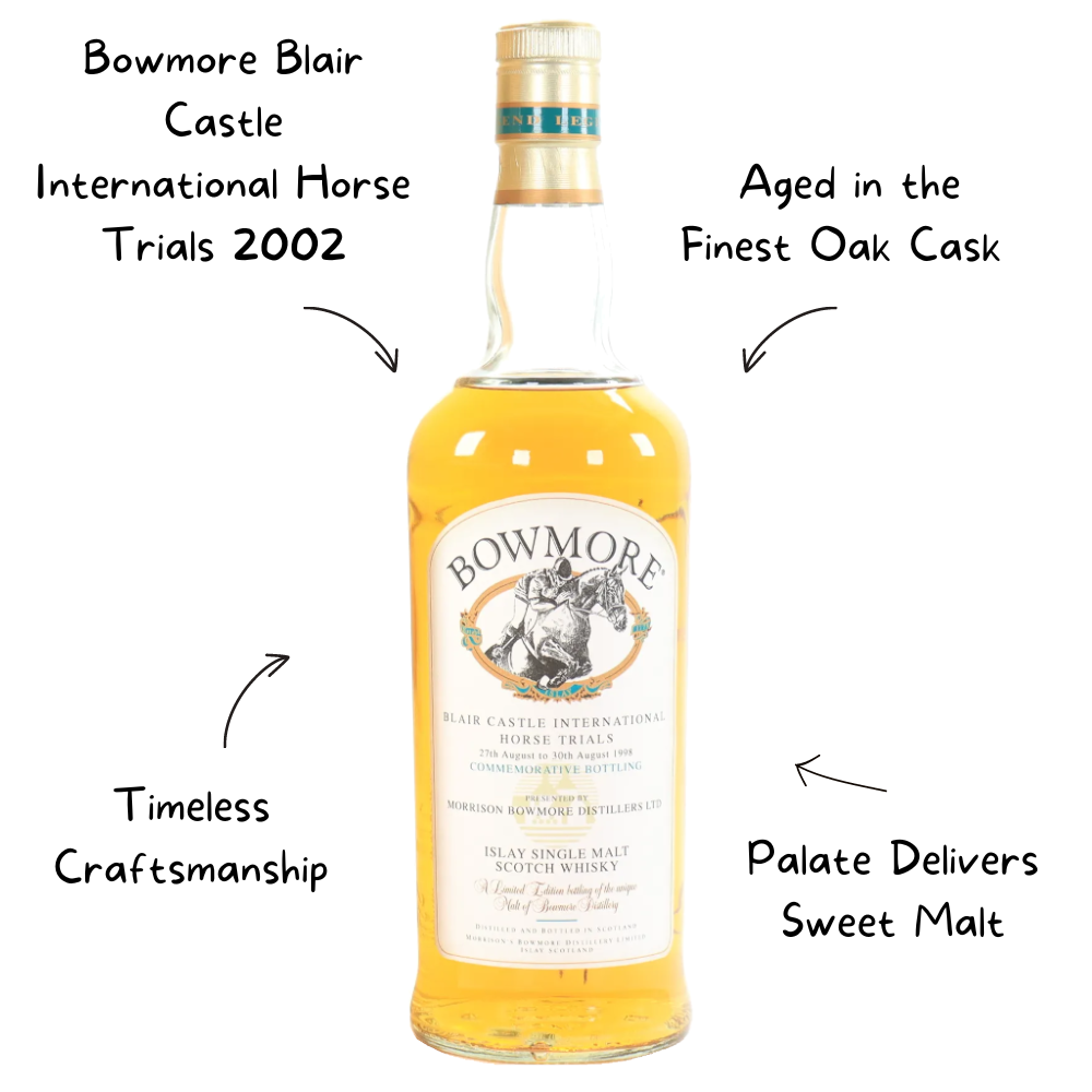 Introducing the Bowmore Blair Castle International Horse Trials 2002, a limited-edition single malt whisky that celebrates the prestigious Blair Castle International Horse Trials. Distilled by the renowned Bowmore distillery, this exquisite release features a harmonious blend of rich peat smoke, honeyed heather, vanilla, and sea salt on the nose. The palate delivers sweet malt, dark chocolate, dried fruits, and a touch of spice, balanced by Bowmore's signature smokiness. The long, warming finish leaves lingering notes of oak, gentle smoke, and citrus zest. Aged in the finest oak casks and housed in an elegantly designed, individually numbered bottle, this whisky embodies the timeless craftsmanship and dedication to quality that Bowmore is renowned for. Perfect for connoisseurs and collectors, it offers an unparalleled tasting experience and honors the rich traditions of both Bowmore and the Blair Castle International Horse Trials.